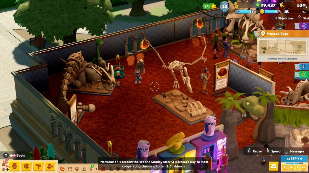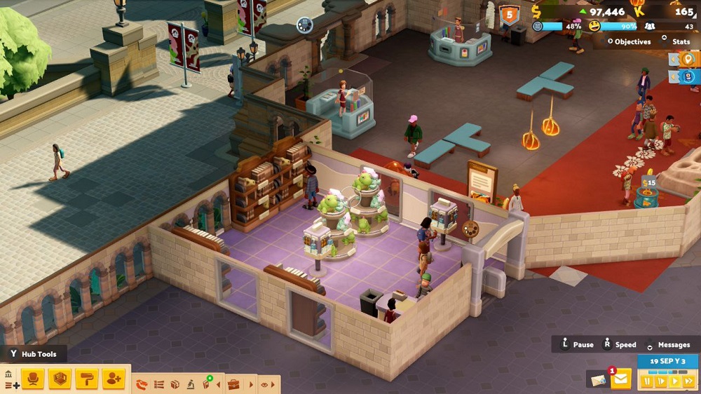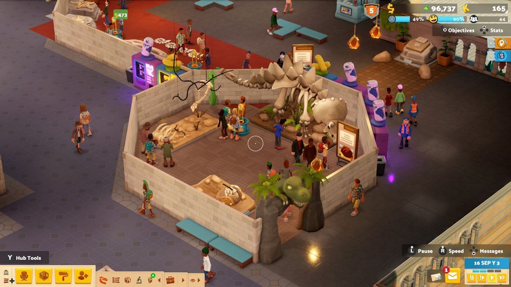 Now, let’s address the inconspicuous elephant in the room: the controls. For the longest time, PC has been the ideal platform for simulation games due to the flexibility of mouse-and-keyboard controls. But that elephant? It simply doesn’t exist here. Two Point Museum’s entire user interface, along with its clever button mapping for every function, works flawlessly despite the hardware’s limitations. The only minor issue is that some fonts and icons can appear a little small in handheld mode. In contrast, playing docked on a 43” TV feels perfect—almost like you’re truly running your own museum. Perhaps the lack of a mouse mode on the Switch 2 is a missed opportunity for the developers. Hopefully they’ll consider adding it in a future patch.